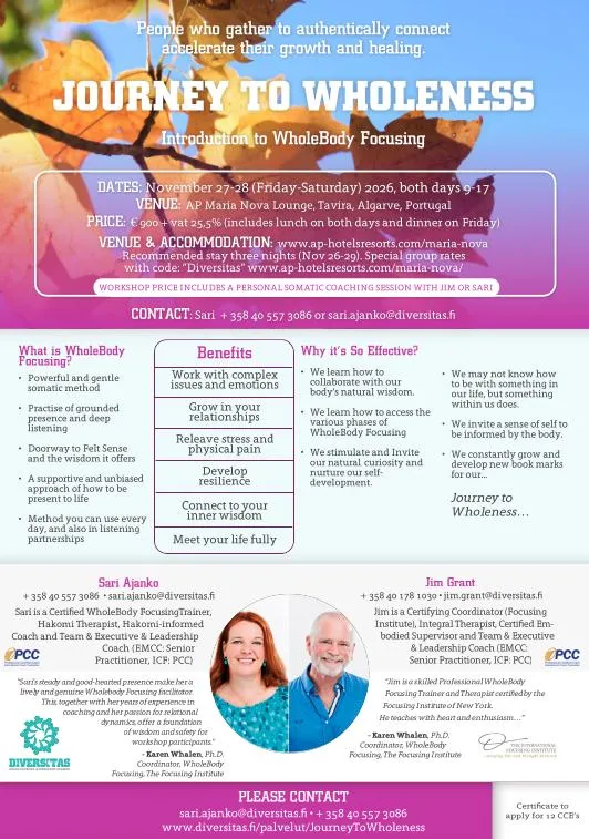 Jim ja Sari toteuttavat avoimia viikonloppukoulutuksia, jossa opitaan menetelmän perusteet (Journey to Wholeness – Introduction to WholeBody Focusing). Seuraava toteutus Algarvessa marraskuussa 2026.