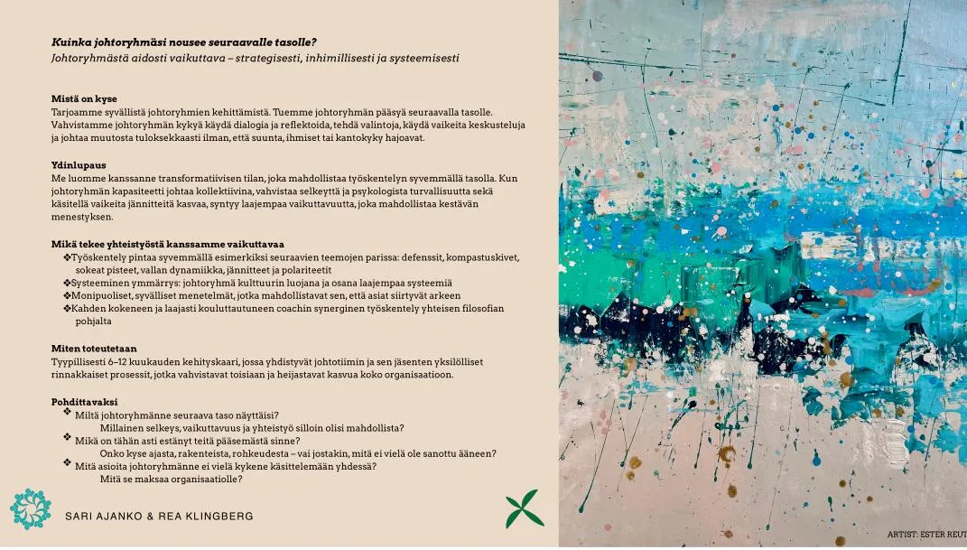 Systeemisten monikriisien värittämässä maailmanajassa johtoryhmät tarvitsevat entistä kokonaisvaltaisempaa ja syvällisempää kehittämisotetta. Johtoryhmävalmennukseen kannattaa panostaa, kun halutaan nousta tiiminä seuraavalle tasolle. Parhaimmillaan johtoryhmä on vahvasti vaikuttava synerginen tiimi.